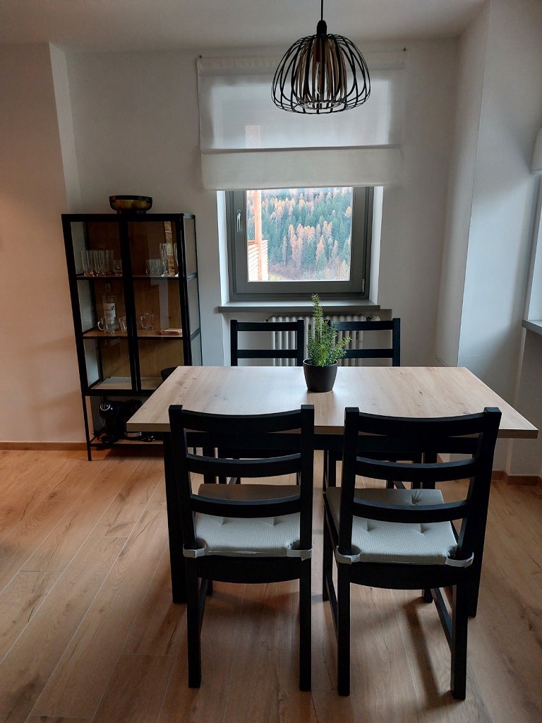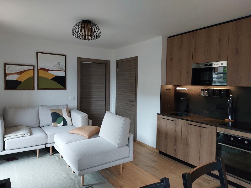 - soggiorno con angolo cottura attrezzato con pentole e stoviglie, frigorifero + vano freezer, forno, tavolo da pranzo e divano